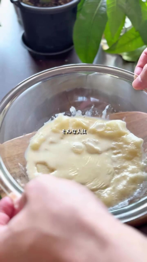 ボウルにサランラップをして、電子レンジ(600W)で3分間チン。熱で溶けたもちと豆乳が絡んだ生地に、メープルシロップ40グラムと米粉80グラム、ベーキングパウダー6グラムを注ぎ、よく混ぜます。