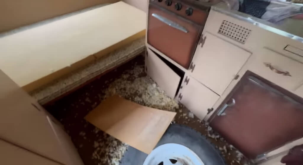 20年ぶりにキャンピングトレーラーの中に入るブルックさんは、懐かしさが込み上げると共に、内部がリスの住処になっていて、ソファーやベッドのスポンジが散乱した荒れ果てた状態にちょっと引き気味の様子。