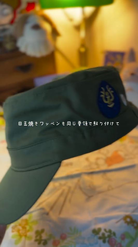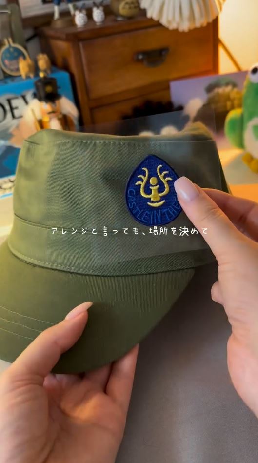 ぶりさんは、シンプルなワークキャップの側面に、大人のためのスタジオジブリグッズを扱うショップ「GBL」で購入した飛行石のワッペンを貼ることに。