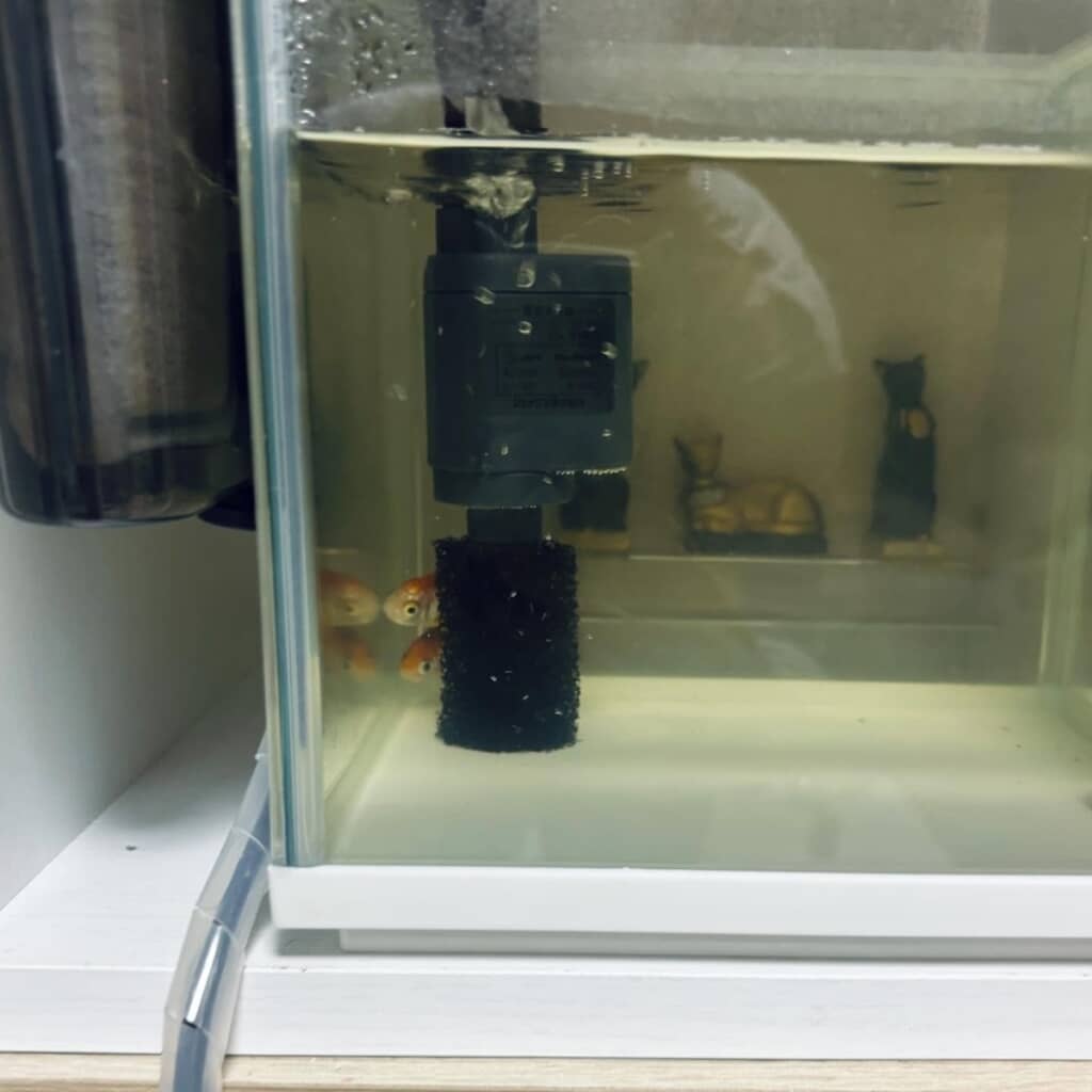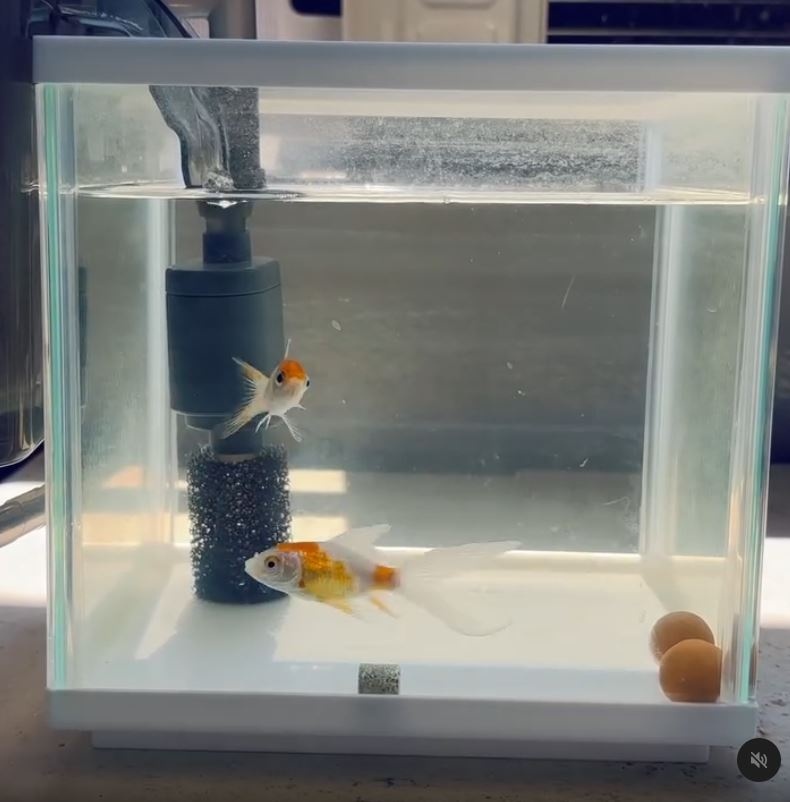 1カ月以上前に、2匹の金魚をお迎えしたAyakaさん。金魚たちは新しい環境になかなか慣れず、「コワイ コワイ……」とでも言わんばかりに隠れてしまい、なかなか出てきてくれなかったそうです。画像には、頭を少しだけ出してこちらをうかがう2匹の姿が。しかし、それから1カ月以上が経過すると……?