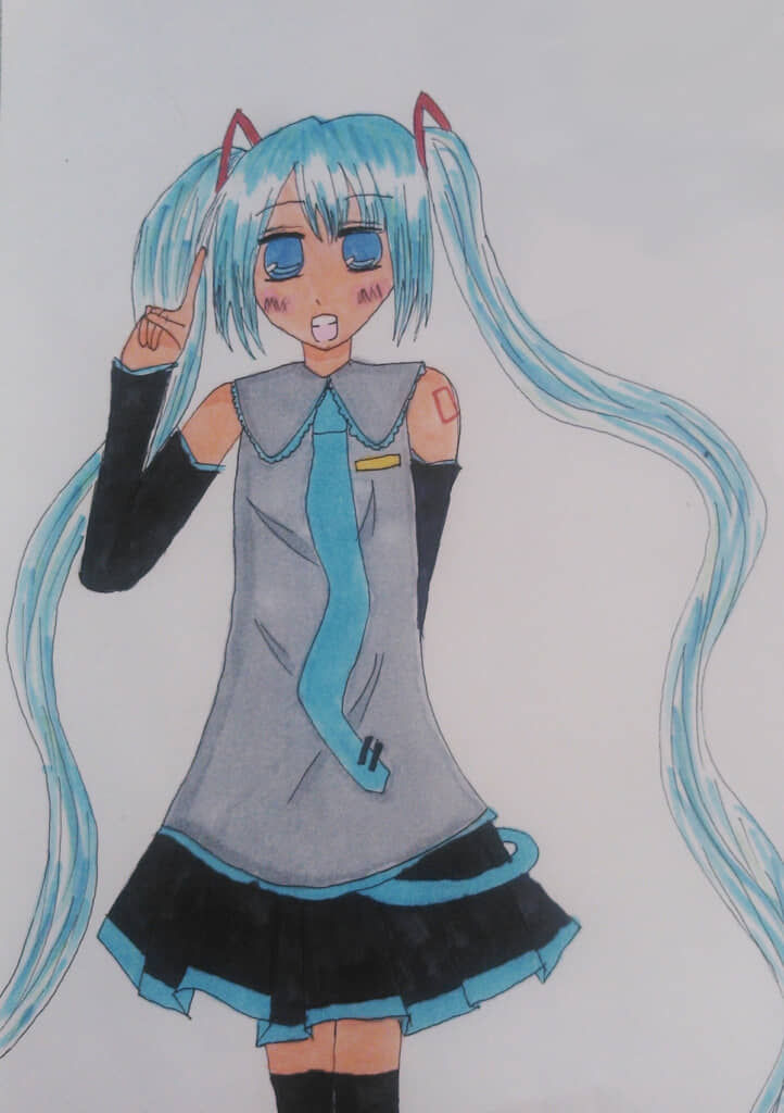 まずは、2013年に描いた初音ミク。キャラクターの特徴をよくとらえ、長い髪の毛には色を塗っているだけでなくハイライトまで入れています。ただ、全体的に線が粗くどこかぎこちない印象。顔のパーツや指などの細かい描写など、改善の余地が多くありそうです。
