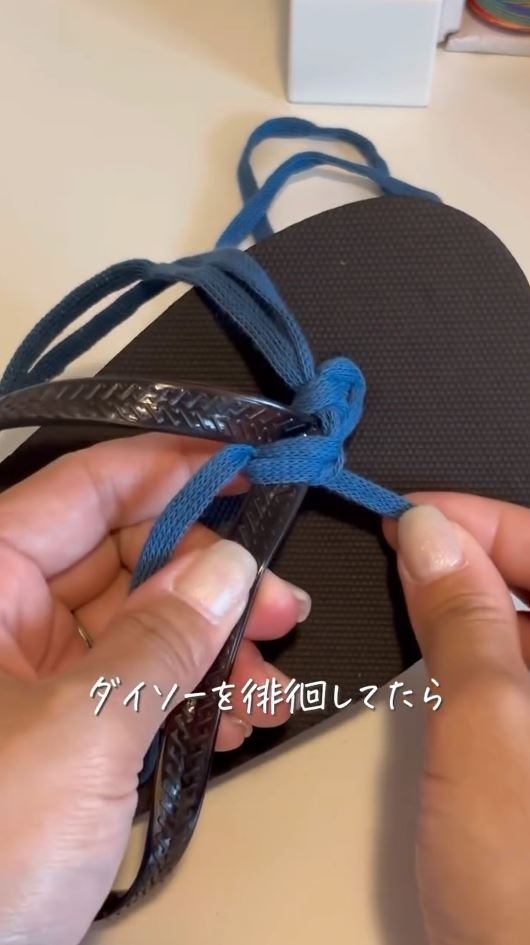まずこれを4本にカット(1本あたり約230センチ)して、左右のビーチサンダルに2本ずつ使用します。続いて2本ずつ半分に折って輪を作ったら、ビーチサンダルの鼻緒と台座の接続部分である前坪部分に引っ掛け、2回平結び。