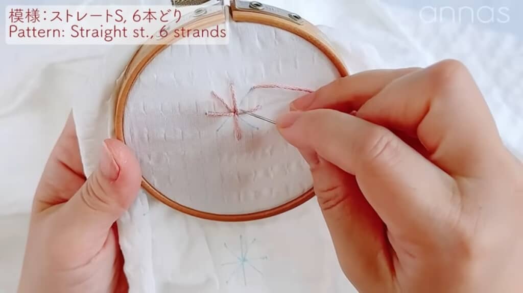図案にそってピンクの糸で刺しゅうをしていきます。刺しゅう糸は6本どり、刺し方はストレートステッチです。外側から中心に向かって1本ずつ順番に刺しゅうしていき、最後は裏で玉止めします。