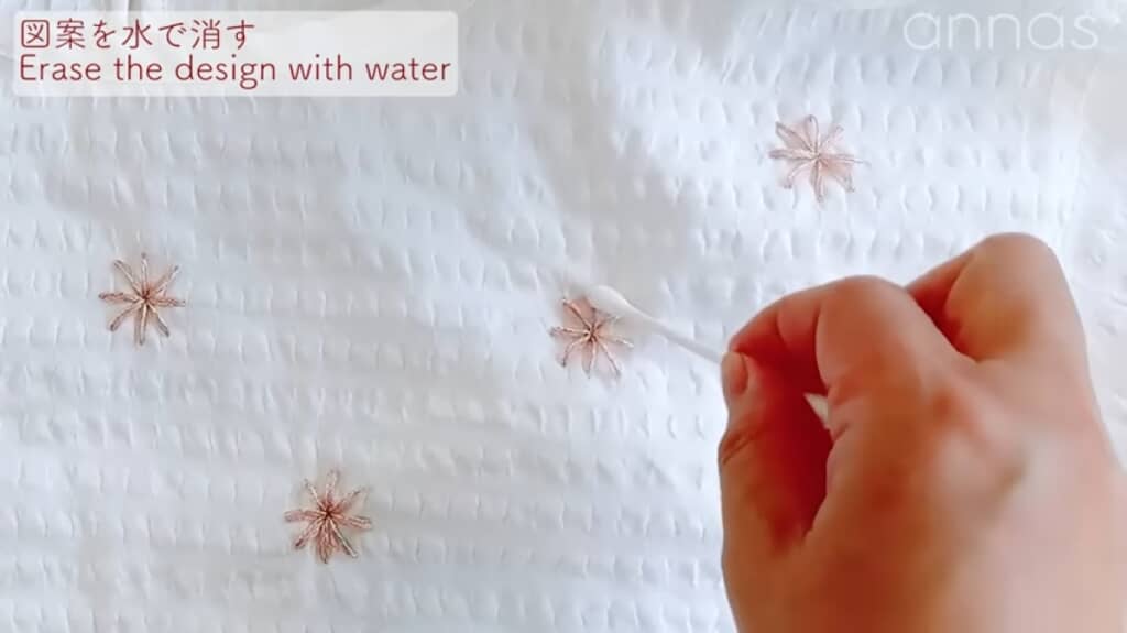 全て刺しゅうし終わったら、最初にチャコペンで描いた図案を消していきます。チャコペンは、水をつけて濡らすと消えるので、1つずつ綿棒で消していきましょう。もし消し忘れがあっても洗濯すれば大丈夫です。
