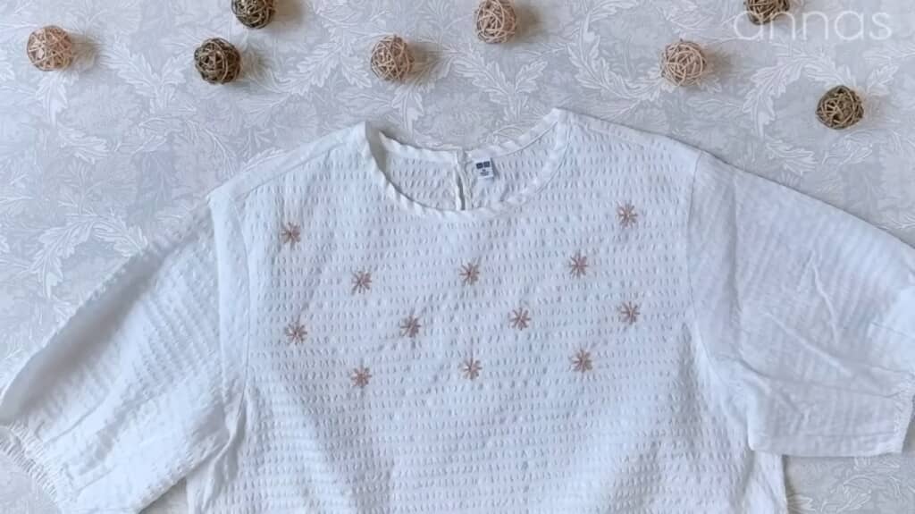 シンプルなユニクロの白シャツが、さりげなく愛らしい刺しゅうが施されたシャツに大変身! 刺しゅう糸の色を変えたり、刺しゅうする場所を袖部分などに変えたりすれば、また違った印象のシャツが出来上がりそうです。刺し方もストレートステッチのみなので、初心者でも挑戦できますね。