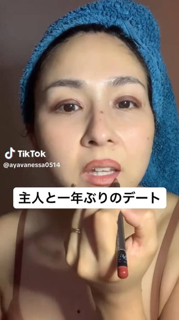 動画に添えられたコメントで、「結婚して子供が2人産まれて、なかなか夫婦2人だけの時間ってつくれない」と1年ぶりのデートとなった理由を説明した亜耶さん。シャワー後なのかタオルで頭を覆った状態で、さっそくアイメイクをスタートします。目を閉じて、まぶたの上へ指で豪快にアイシャドウをスーッ。一直前に伸ばした艶のあるブラウンが、まぶたをゴージャスに彩りました。
