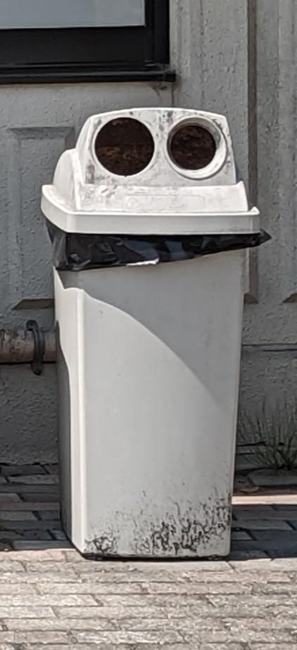 整然と並べられたごみ箱は、2つある投入口が目のようで、フタのふちや飛び出した黒いごみ袋が口元、直線的なボックスを胴体と思えば……ロボットのように見えてきました! 中央に配置されたちいさなごみ箱は、ロボット一家の子どものように思えてきますね。
