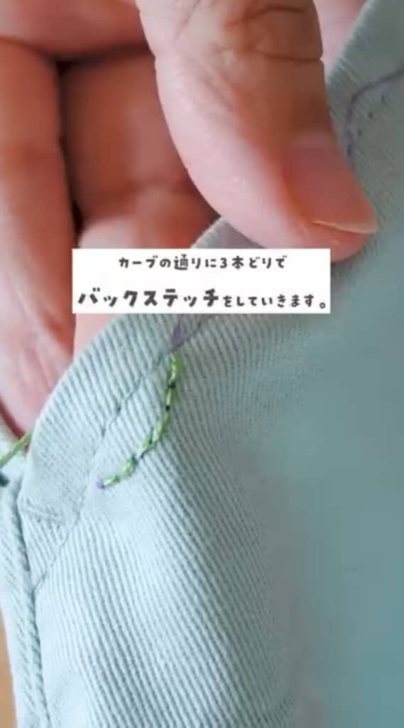今回は、娘さんにとても好評で、「お花畑おズボン」と呼んでくれるようになったという刺しゅうモチーフの作り方を紹介しました。まずは無地のズボンを用意し、その前ポケットの入り口と、後ろポケットの下側の角に、フリーハンドで縫い目をまたぐようにチャコペンで波線を描いていきます。