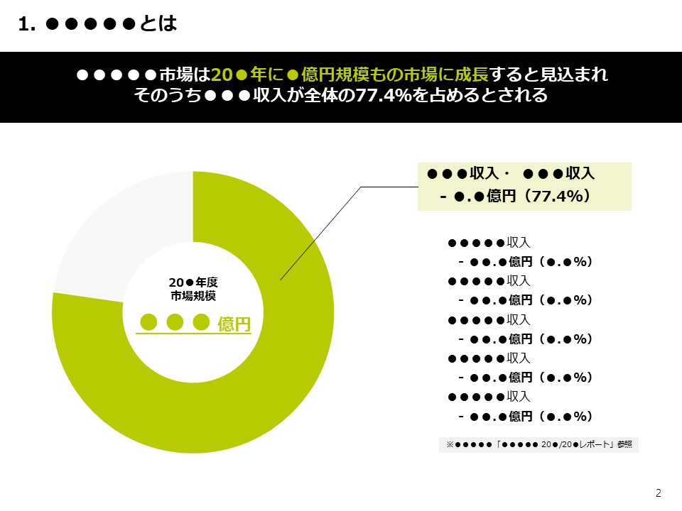 市場規模とその内訳を示す円グラフ。テキストは随所にフォントサイズ4ポイントの改行を入れて、行間を細かく調整していた。