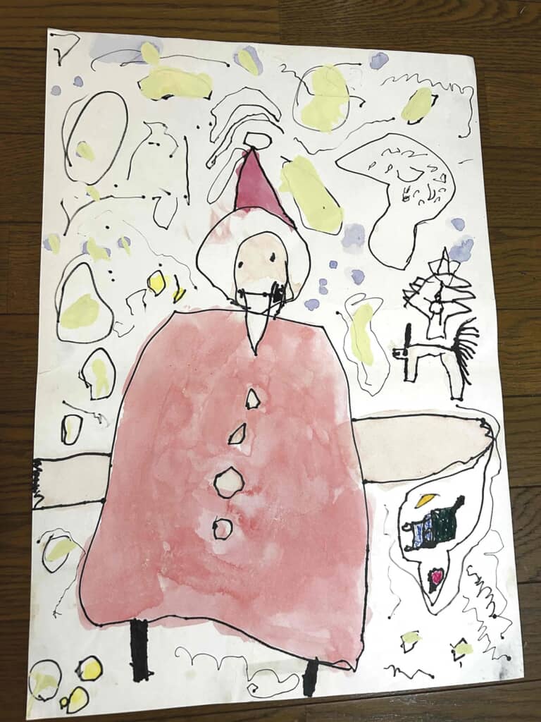 さらに背景には、トナカイやもみの木らしきものも確認できます。場所は、雪が降っている森なのでしょうか? 体の描き方などは子どもらしく幼い絵ではあるものの、ひと目でサンタクロースであることが分かるうえ、それを演出するさまざまなものがきちんと描かれているところ、すでにセンスを感じますね。