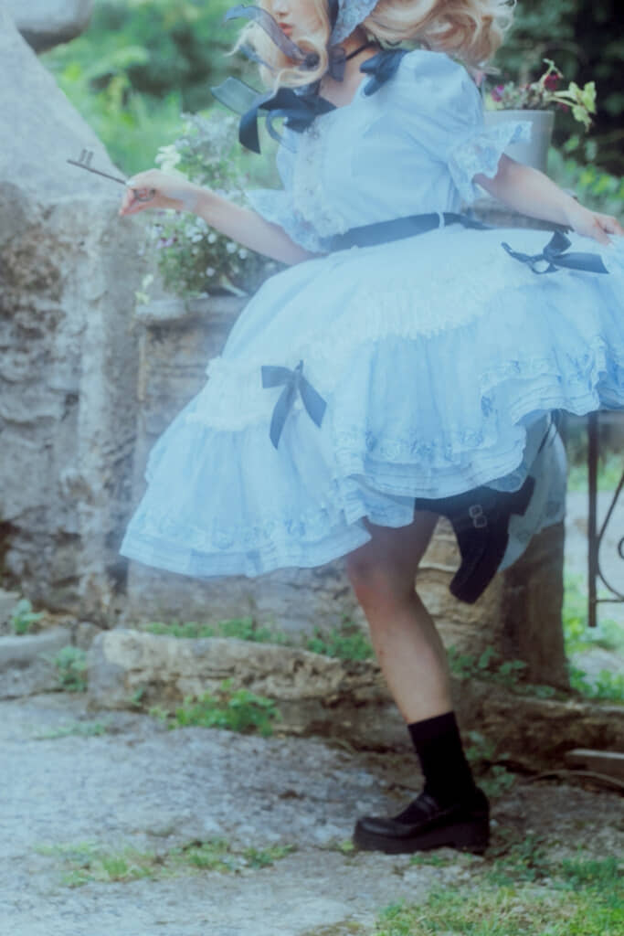 完成したのは、淡い水色のドレス。袖はふんわりと丸みのあるパフスリーブで、布地と同じトーンのレースで袖口やスカートの裾を飾り、胸元とスカートには白いレースをあしらいました。紺色のサテンリボンが首元や肩ついているのもポイント。甘さと品のある“アリス風”の世界観を思う存分感じられる仕上がりです。
