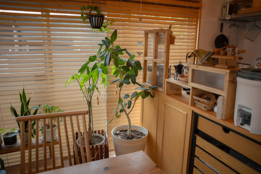 築古とは思えない、おしゃれなカフェのような空間に驚かされます。観葉植物をたくさん並べ、ウッド調のアイテムを多く取り入れているようです。