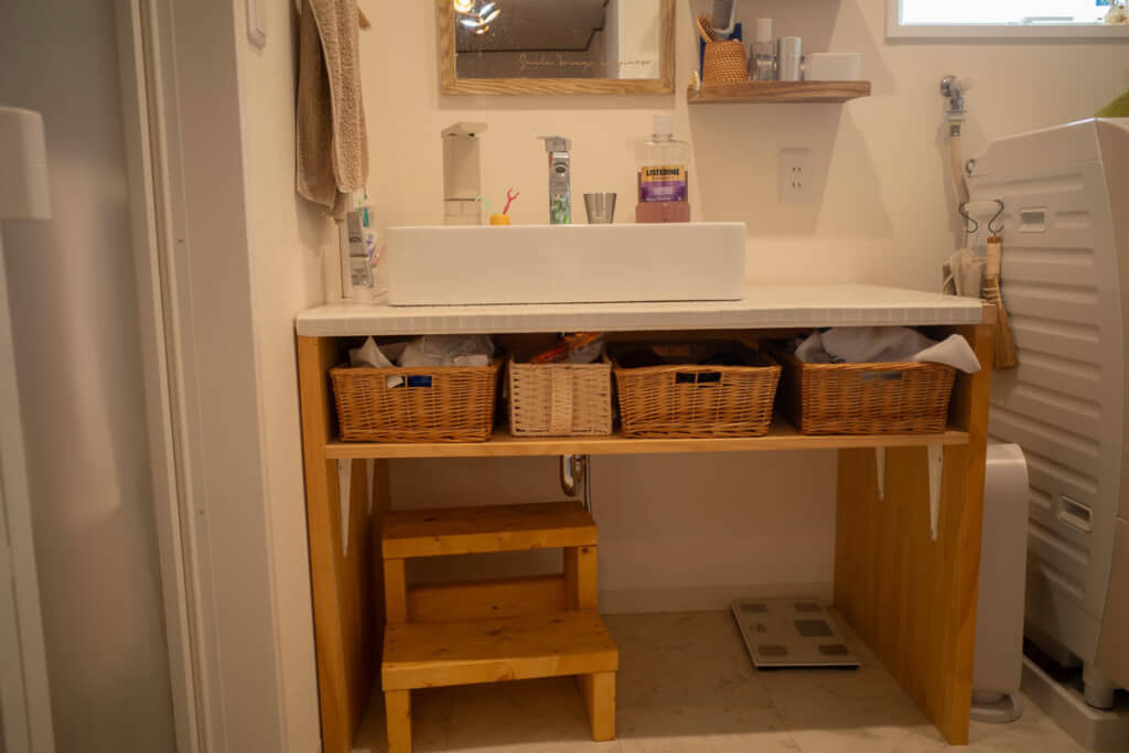 洗面所・風呂場は広々としており、快適そうです。洗面所には備え付けの鏡付き洗面台がありましたが、自分たちで取り外して、白くてコンパクトな洗面台を手作り。洗濯機やお風呂のバスタブも新しくなっています。