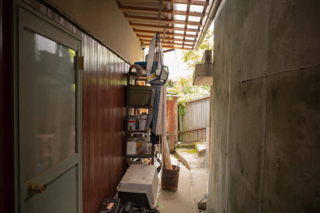 裏口から出てすぐの場所は細い路地のようになっています。当初はバイクを停めているだけでしたが、棚を置きさまざまな道具を保管するスペースになっているようです。