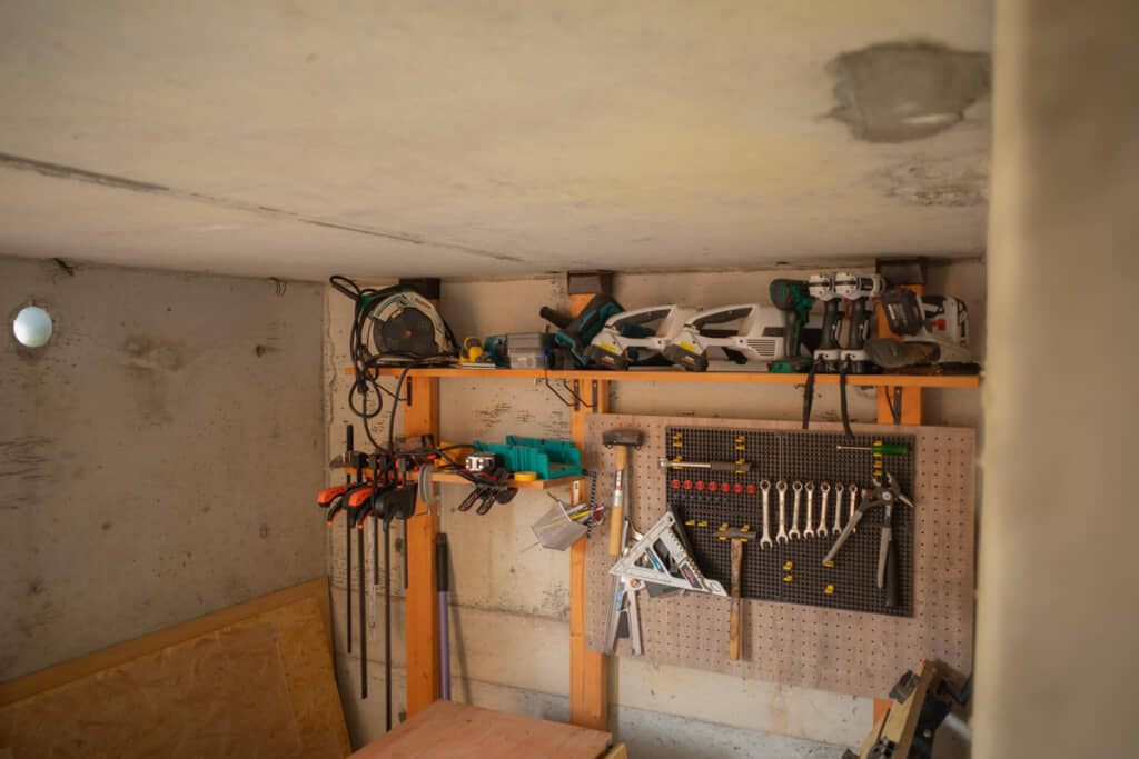 さらに倉庫は、工具類を置き作業場として活用。突っ張り棒で作った棚の上には、多くの機械がきれいに並んでいます。