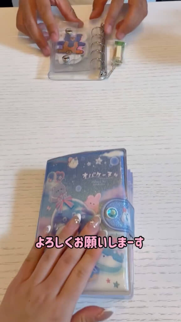 まずは、お互いのシール帳を交換。しかし、373さんのシール帳を見たちゅんさんは、そのサイズの違いにびっくり。自信なさげに「ちょっとしょぼくて僕の」と自分のシール帳のボタンを外して渡します。