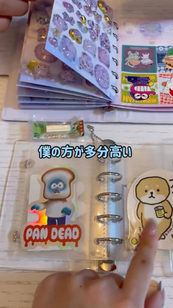 そんなちゅんさんのシール帳はというと、カードファイルに大きめのステッカーを2枚ずつ収納したタイプ。お気に入りは、ベビーチーズやカイジのシールだといいます。ただ、量は少なく373さんは思わず「思ってるシール交換じゃないんですけど」と一言。確かにこれはちょっと違う……。
