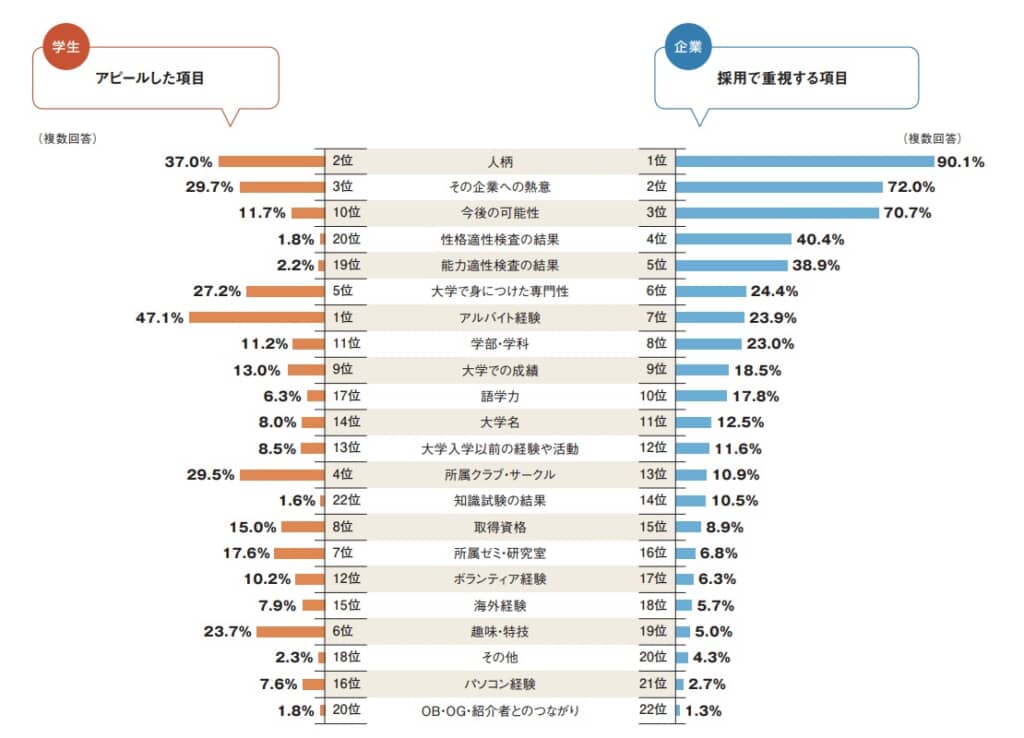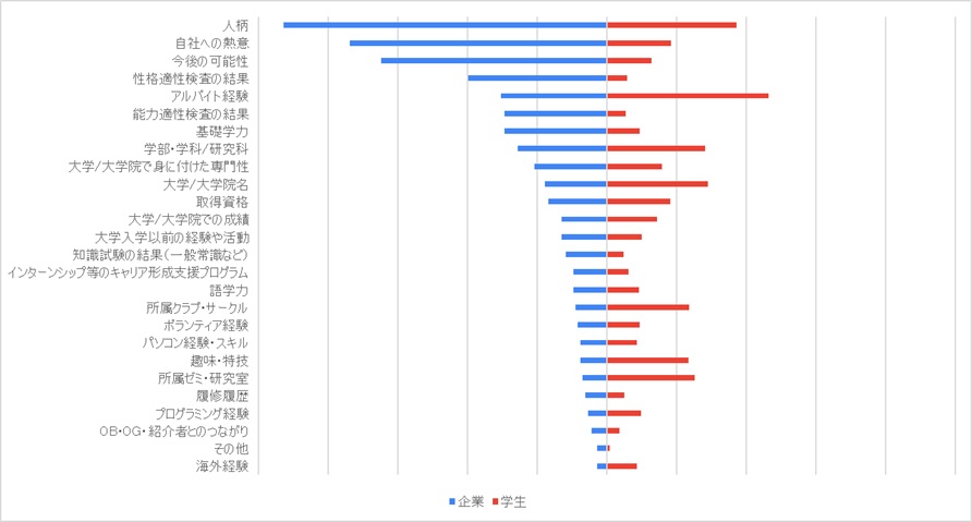 他にも「所属クラブ・サークル」が就活生4位に対して企業13位、「趣味・特技」が就活生6位に対して企業19位、「所属ゼミ・研究室」が就活生7位に対して企業16位など、項目によっては大きな開きがあります。