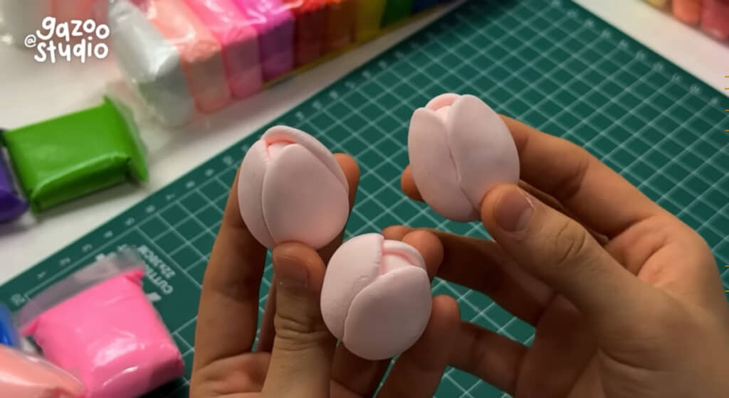 混ぜた粘土を3つに分けたあと、それぞれを俵状に丸めて花びら型の粘土で包んでいくと、やさしい色合いのかわいいチューリップが出来上がりました。