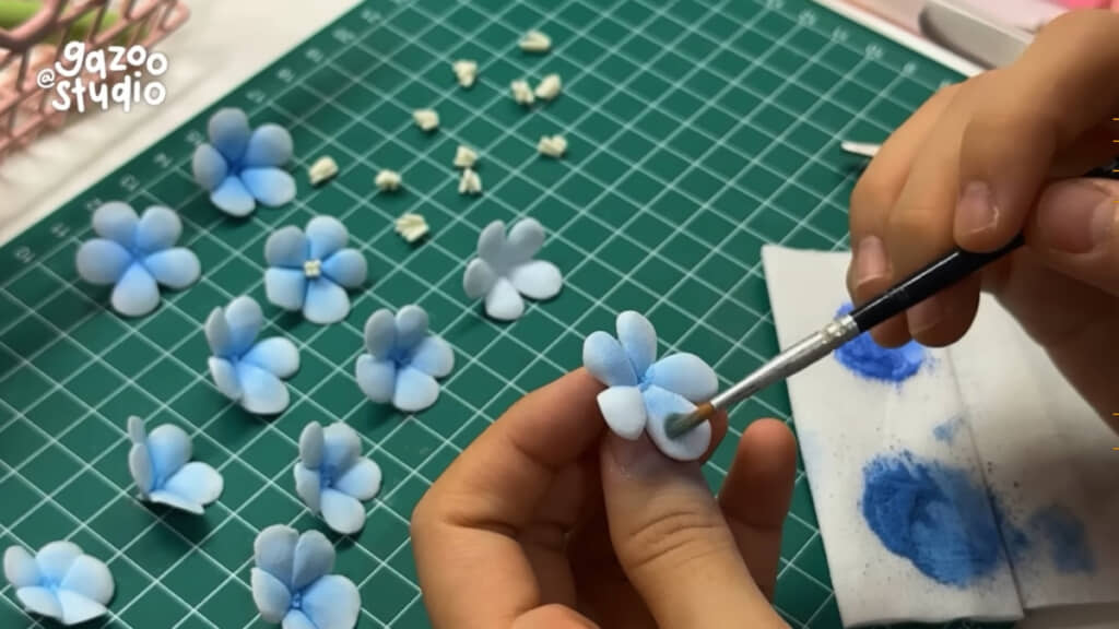 小さな花にパウダー状の青いチョークパステルで色をつけていくと、淡いパステルブルーのワスレナグサ風の花が出来上がりました。