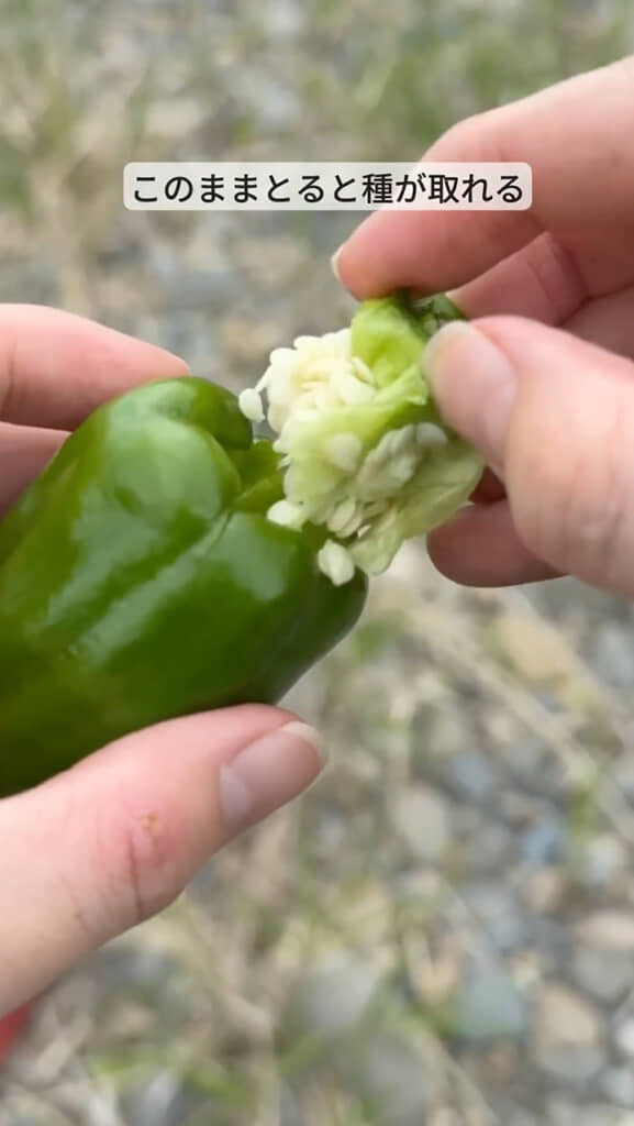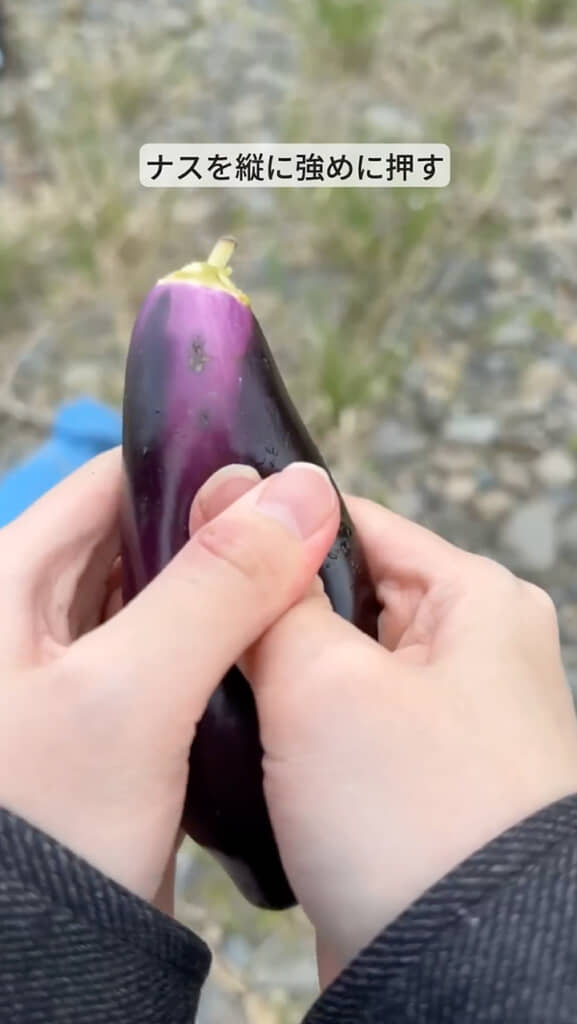 まず、ナスは縦にぐっと強めに押すことで皮に亀裂が入り、そこから裂くとキレイに割れます。そして、ピーマンはヘタを強く押してそのまま引っ張ると簡単にタネが取りのぞけます。あとは、手で好きなサイズに引き裂くだけ。包丁がなくても野菜の下準備ができちゃいました!