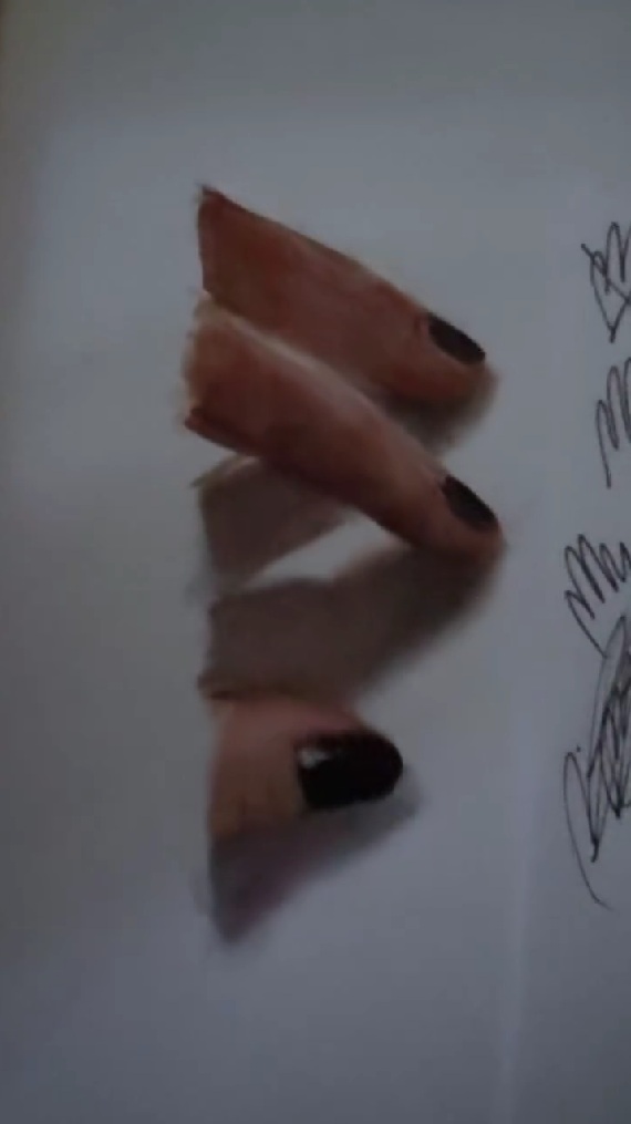 いくつか手を描いたら、途中からぐるぐると塗りつぶすような動きをし始めます。そしてカメラが一度バウンドするように絵に近づいたのち、引きの映像になると……なんと、紙をおさえていた左手が、実はリアルに描かれた絵だったことが明かされます。全然気づかなかった……。