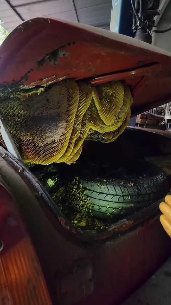 なんと、トランクの中にはぎっしりとハチミツが詰まった分厚い巣板が! 投稿者さんは「2年近くはここに巣があったのでは」と推測します。実は投稿者さんは、年間を通じてミツバチの救出活動をおこなっている人物だったのです。