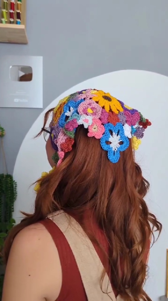 バブーシュカは、編み物ブームとともに日本でも流行が続いているファッションアイテム。Brunaさんが作った作品は、カラフルな花々をたっぷりつなげることで個性を感じられ、ぱっと目を引くおしゃれなデザインになっています。