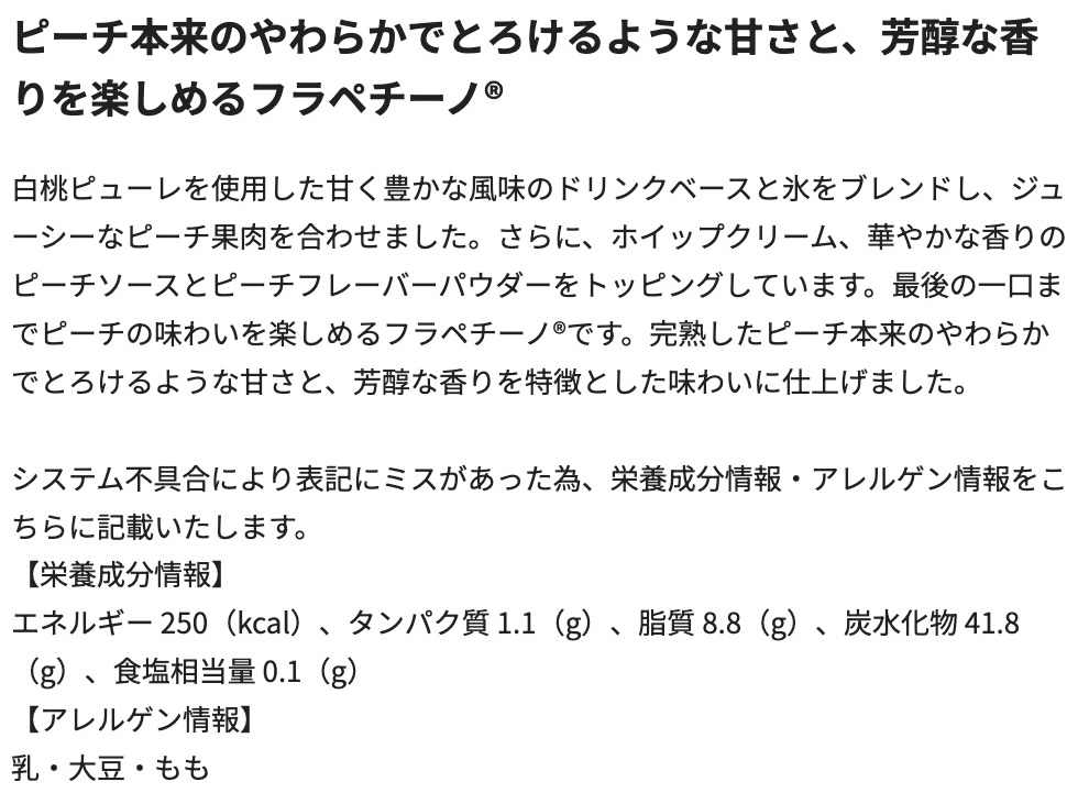 その後、公式サイトの同商品のページには、「システム不具合により表記にミスがあった為、栄養成分情報・アレルゲン情報をこちらに記載いたします」として、「250kcal」と正しい表記が記載されています。なんだーーー、やっぱり間違いだったのか!!!