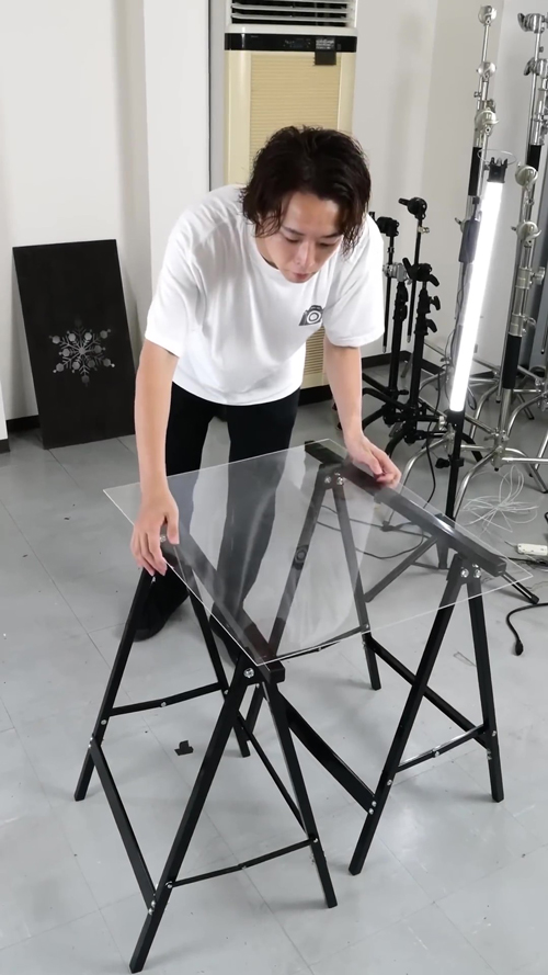 つづいて撮影台の準備です。ガラスのテーブルを用意したら、その上にさきほど作った黒い板を設置。後ろの壁にも黒い背景をセットします。下と横から水色のライトで照らし、正面には一眼レフカメラを構えます。
