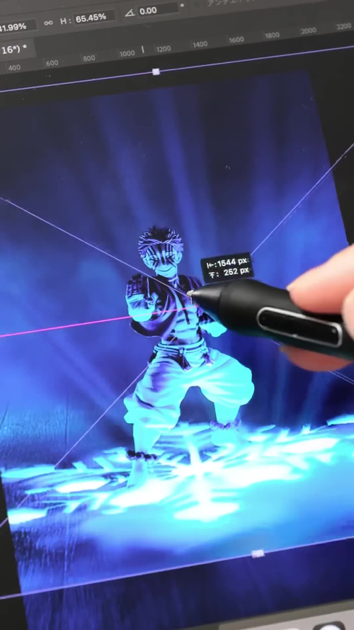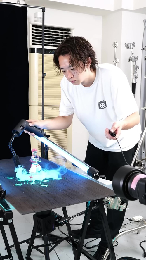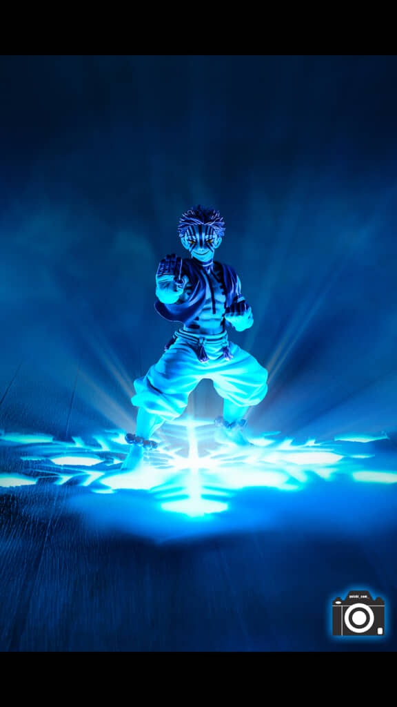 撮影環境が整ったら、今回の主役である猗窩座のフィギュアを中央にセット。切り抜いた柄の上に立たせ、煙を出しながら何枚もシャッターを切ります。