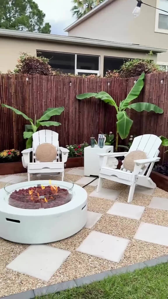 芝生を剥がした場所には、正方形のタイルを並べてすき間に砂利を流し入れて薬剤で固定。イスなどの家具を置けるスペースができました。
