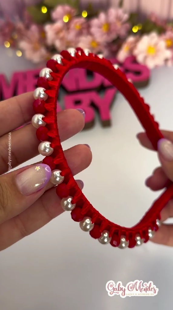 動画は、土台として使う黒いカチューシャに両面テープで赤いリボン貼り付けるところから始まります。黒いカチューシャの前面をリボンで覆って赤くしたら、別のリボンに、パールとクリスタルのビーズを丁寧に通していきます。