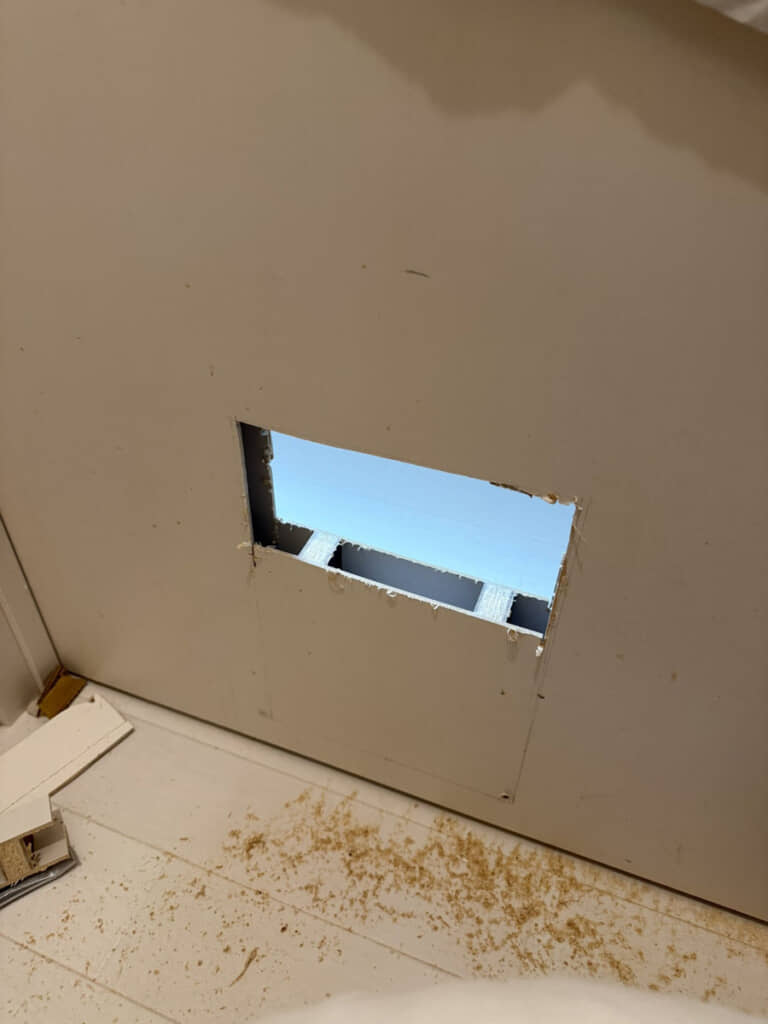 開いた穴から手を突っ込んでじゃまなパネルをどうにか排除し、おがわさんは無事ドアの開放に成功しました。大きな物をドアのまわりに置く危険性について、「このようなことは場合によっては大変危険ですので注意喚起になればと思います」と語りました。
