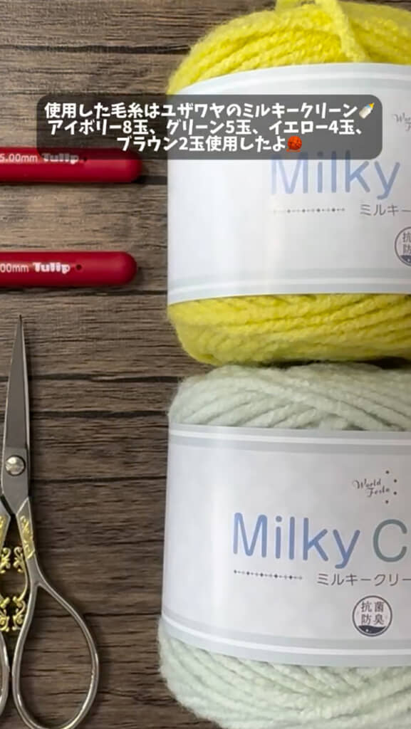 今回は、ひまわりブーケブランケットの葉っぱの編み方を解説していきます。使用する毛糸は、ユザワヤで販売されている「ミルキークリーン」のアイボリー8玉、グリーン5玉、イエロー4玉、ブラウン2玉です。