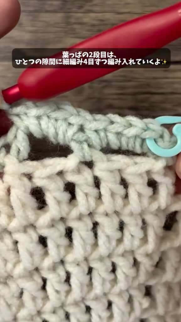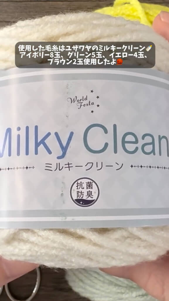毛糸はなんでもいいそうですが、ミルキークリーンは1玉107円(税込)とリーズナブルで、肌触りもよく高品質。TSUMUGIさんおすすめの毛糸とのこと。それでは、早速グリーンの毛糸で葉っぱ部分を編んでいきます。