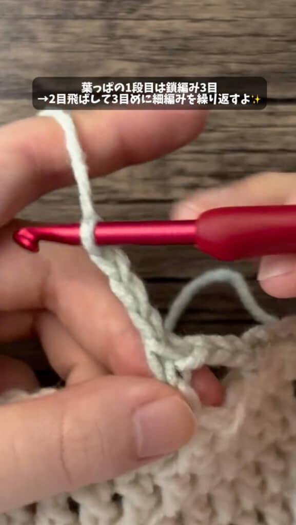 1段目は鎖編み3目、2目飛ばして3目めに細編み。ぐるっと1周編めたら、2段目はひとつの隙間に細編みを4目ずつ編み入れていきます。