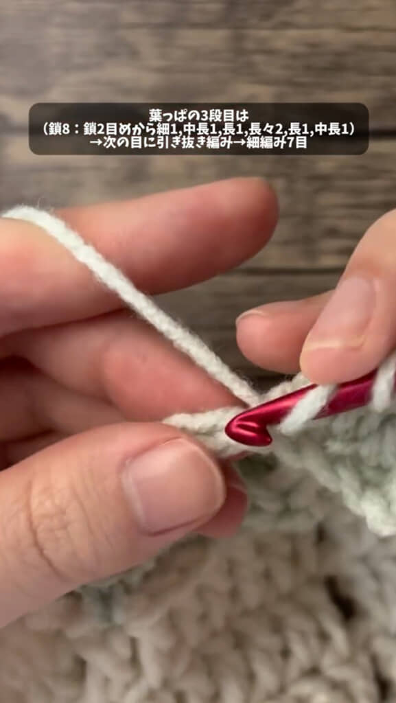 3段目は、鎖を8目編みひとつ飛ばして2目めから、細編み1目、中長編み1目、長編み1目、長々編み2目、長編み1目、中長編み1目を編んで、次の目に引き抜き編み、細編み7目を繰り返します。