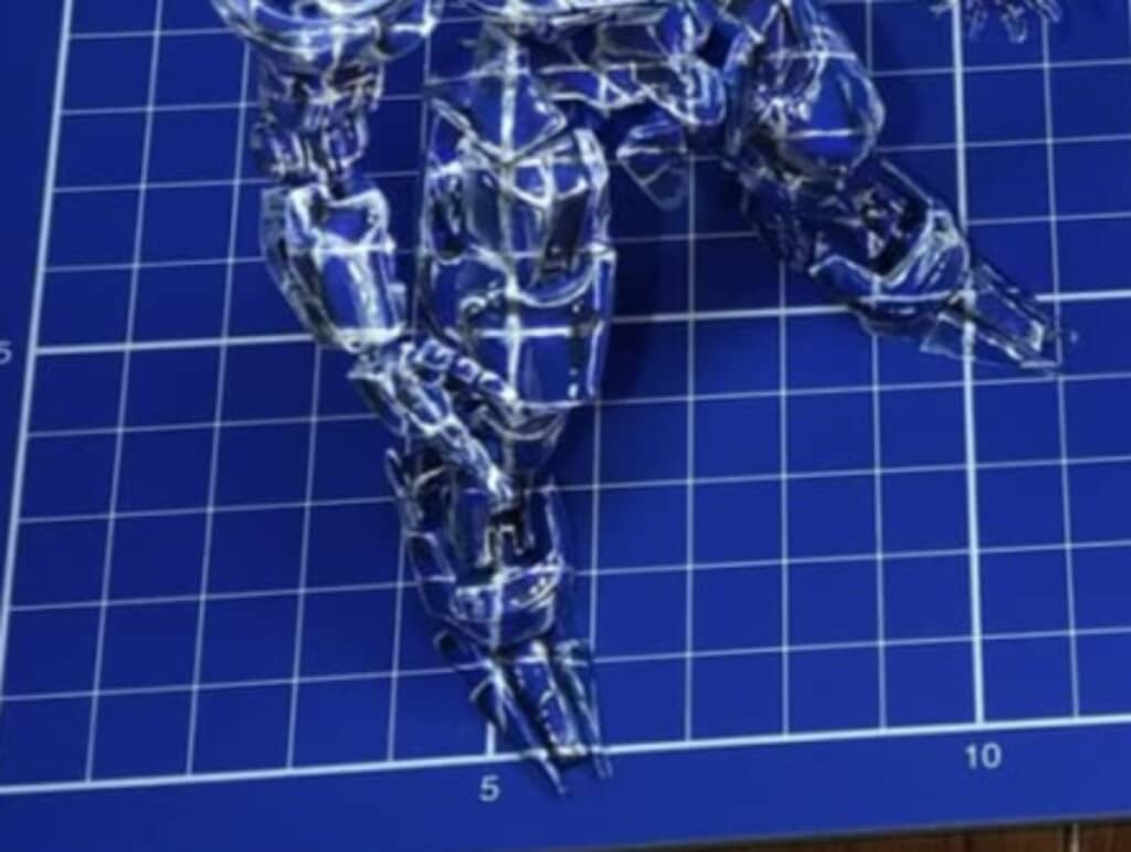 今回の題材は、アニメ『機動戦士ガンダム 水星の魔女』に登場する「ガンダムエアリアル」のプラモデル。リューノさんの手により透明となったことで、下に置かれているカッターマットの青い地や白いラインが透けて見えます。