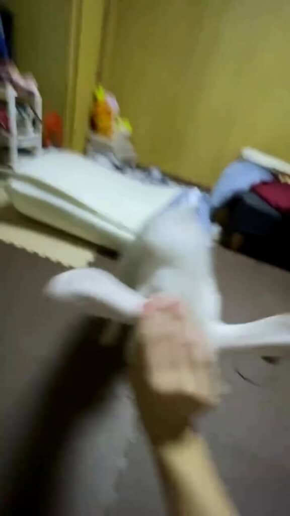 そしてベッドの上からママさんに向かって大ジャンプ! 走り回る姿は子犬のようでしたが、跳躍する姿を見ると、「やっぱりヤギなんだなぁ」と感じます。その後もよろこびを抑えきれなくて跳びはねたり、人形に頭突きしたりの大はしゃぎ。まるでアニメーションみたいです!