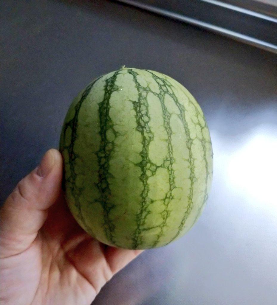 そんな津田さんが今回投稿したのは、直径10センチほどなのに茎が枯れてしまったというスイカの写真。本当はもっと大きくなるはずですが、茎が枯れてしまったため手のひらサイズのまま収穫したといいます。まだ小ぶりなこともあり、中身が白かったら漬物にでもしようと考えていたそうです。