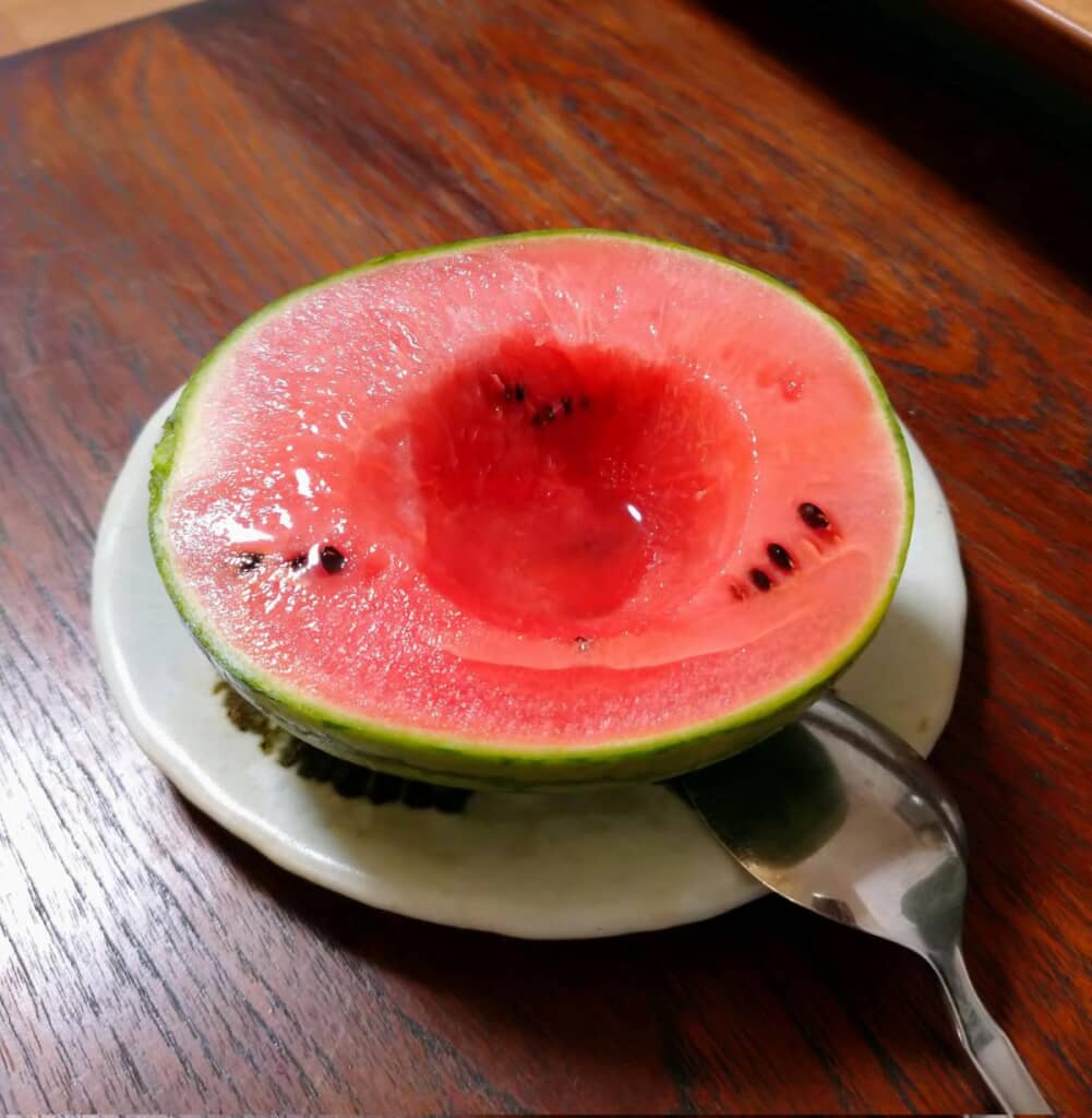 取ったばっかりでぬるくなっていたので、しばらく冷やしてから食べてみたという津田さん。甘味は少し薄かったものの、フレッシュでおいしいスイカだったとのこと。それにしても半分のスイカを食べるってなかなかない経験かもしれません。なんだかお皿やスプーンがめちゃくちゃ大きいのかと見間違えちゃいそうです。