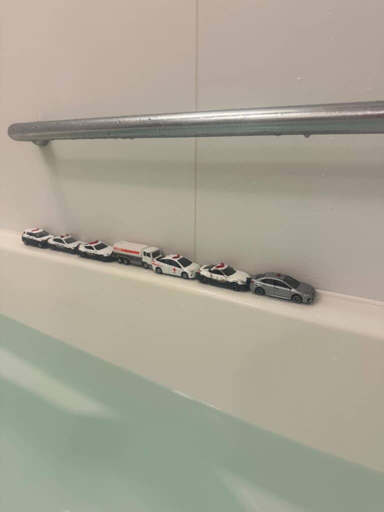 もちろん車は本物ではなく、3歳の息子くんのものと思われるトミカ。大切なトミカを、きれいに並べたのですね。そしてよく見ると、7台のうち最前に停まっているのは覆面パトカーで、さらに前から3番目は赤十字の献血運搬車です。事態はかなり深刻そうで、想像がどこまでも膨らんでいきそうですね。