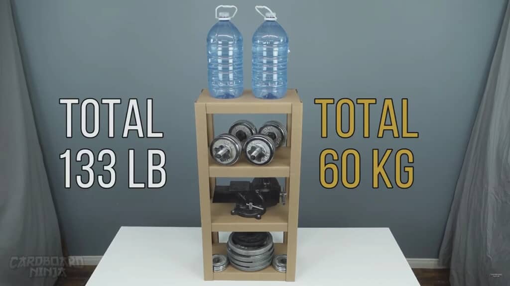 完成したラックは、内部の補強構造によって高い耐荷重を実現。なんと、棚にダンベルや重りをたくさん乗せても崩れません! 耐荷重はおよそ60キロもあるとのことで、その頑丈さに驚かされます。
