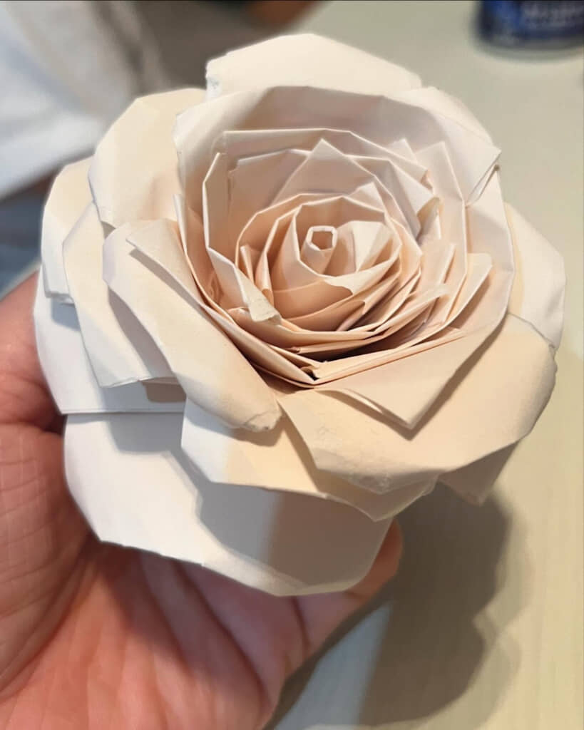 投稿したのは、コスチュームデザイナーの生澤 美子(@yoshikoikezawa)さん。娘さんが紙を重ねて作ったのは、美しいバラの花でした。