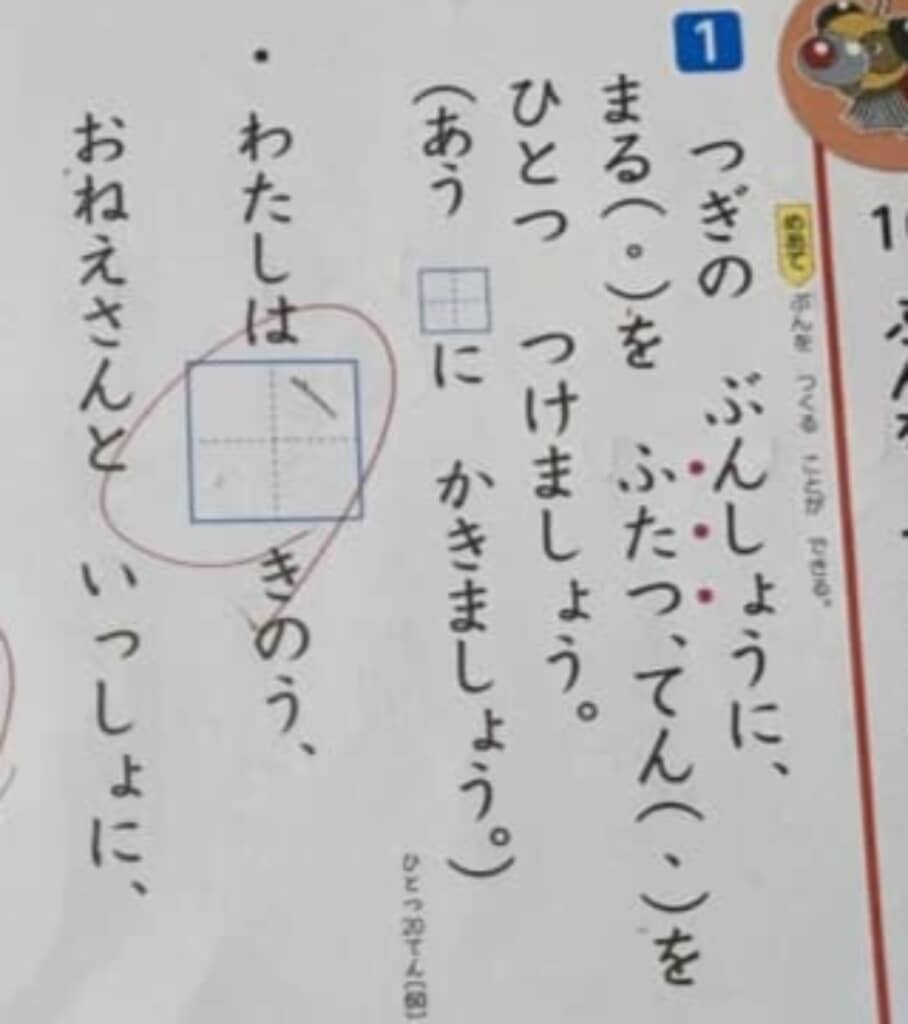 「また いきたいです」のあとに句点を入れる問題では、なぜか「ね」を入れてしまい、語りかける文章に。先生も「そうですね」とコメントを入れてくれていました。