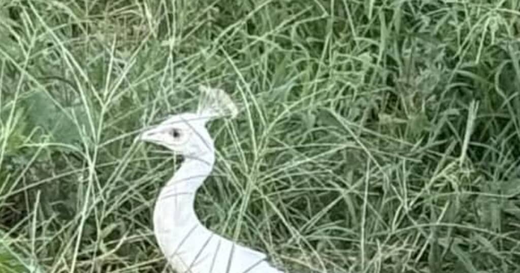 投稿者は、さまざまなプラモデルをミックスして制作、完成した作品をXで公開している田中重工業(@hobbyseidai)さん。畑でナスを収穫していたところ、なんと孔雀に遭遇したのだそうです。しかもよく見ると、本来鮮やかなはずの色が抜け落ちている「白孔雀」でした! これは珍しい……。