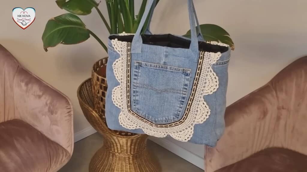 最後に取っ手をしっかりと縫い合わせると……使い込まれたジーンズが、買い物やお出かけにぴったりのかわいらしいバッグに大変身! デニム特有の丈夫さはそのままに、レースや飾りのディテールが加わったことで、カジュアルすぎず上品さも感じられるデザインになりました。
