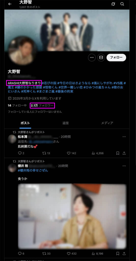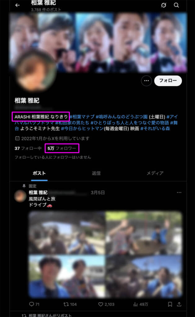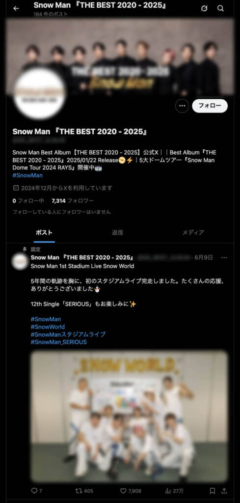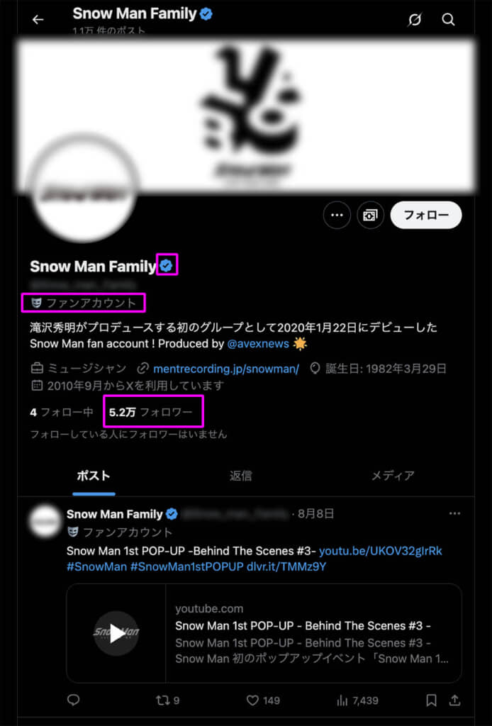 5万2000人のフォロワーを獲得しているSnow Manのなりすましアカウント。ブルーバッジが付与されていることから騙されている人が多い様子。なお青いチェックマークは有料サブスクリプション(X Premium)加入の表示で、本人確認の保証ではないため注意が必要です
