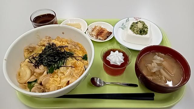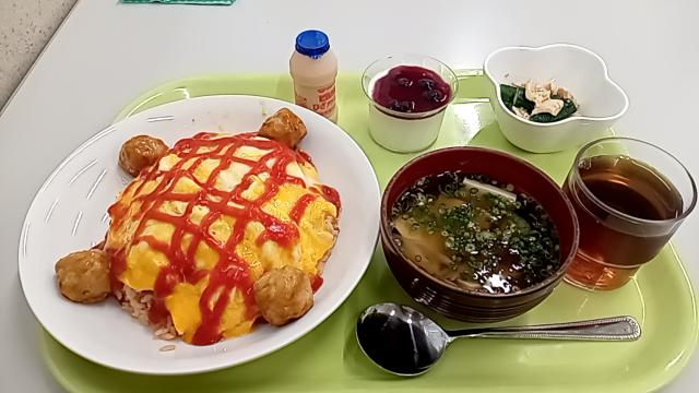 その日のメニューはお茶碗いっぱいのご飯に、主菜はオーロラソースのかかったエビカツ2個と焼き魚。副菜はきんぴらやきゅうりとちくわの和え物で、栄養バランスも良さそうです。さらにみそ汁や納豆、デザートのコーヒーゼリーまでついています。